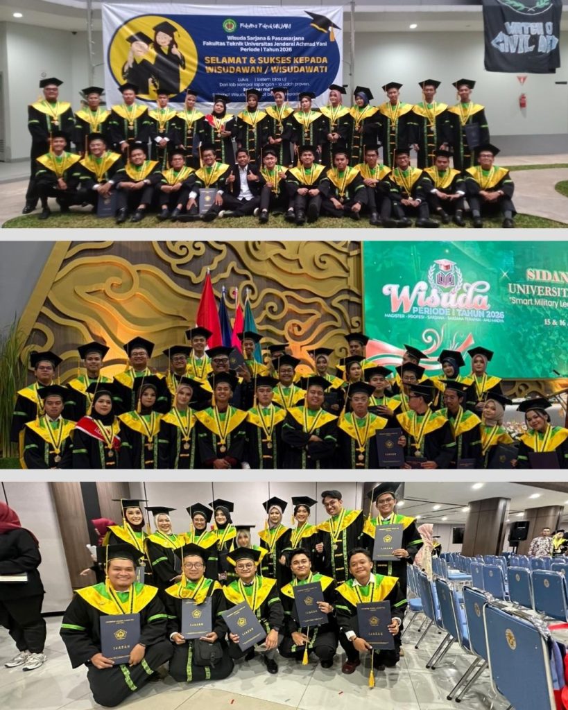 Pada Hari Rabu, 15 April 2026 menjadi hari penuh syukur bagi keluarga besar Program Studi Teknik Sipil Universitas Jenderal Achmad Yani. Bertempat di Gedung Auditorium Unjani, Cimahi, Civitas Academica Teknik Sipil menggelar “Tasyakur Kelulusan Semester Ganjil Tahun Akademik 2025/2026”.Sebanyak 16 mahasiswa resmi menyandang gelar Sarjana Teknik setelah melalui perjuangan merancang, menghitung, dan menguji berbagai struktur di atas kertas maupun di lapangan.